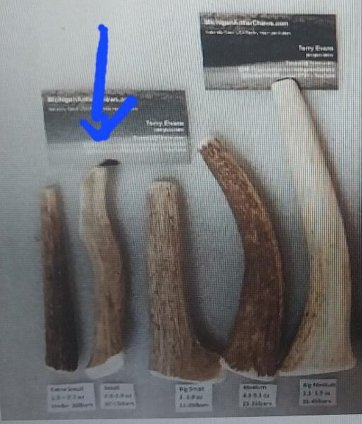 Dog Size – 10-15lbers Antler Weight – 2.2-2.9 ounce each Length – 5-5.5 inches As listed are medium to medium hard. If you need a tad harder or lighter please add a short note with purchase Many Thanks, Terry Michigan Antler Since 1994
