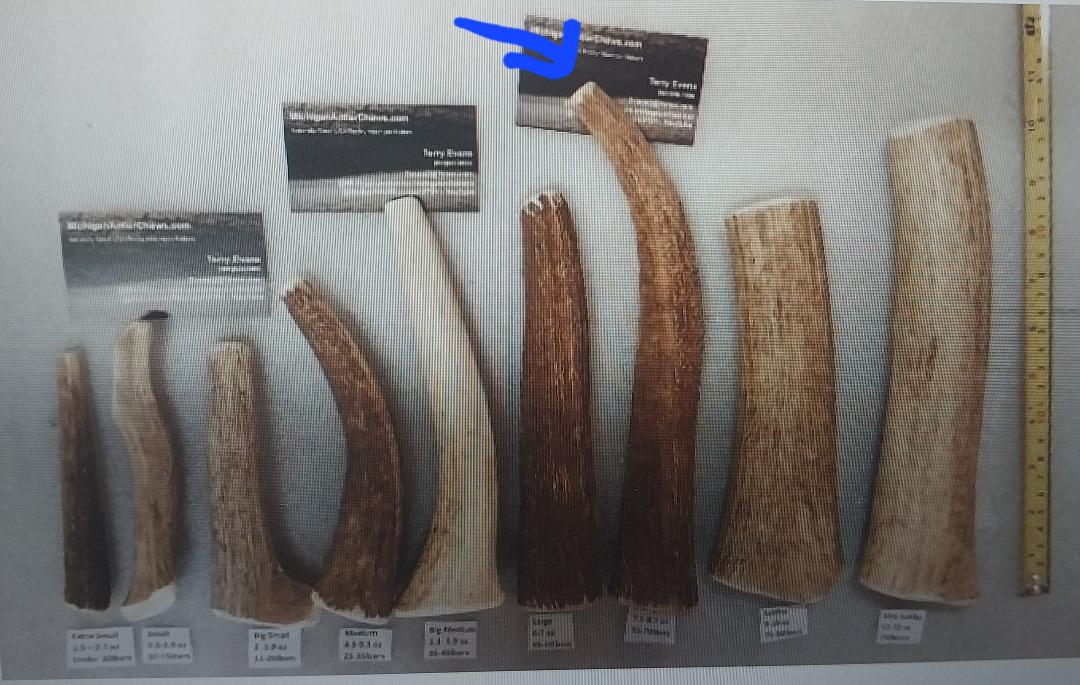 Dog Size – 55-70lbers  Antler Weight – 7.5-8 ounce each Length – 7 to 9 inches As listed are medium hard to hard strength. If you need a tad  lighter please add a short note with purchase 🙂 If you want my bigger Jumbos, see my Jumbo Tab 🙂 Many Thanks, Terry Michigan Antler Since 1994