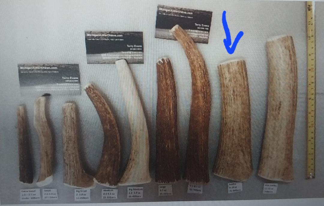 Dog Size – 70-80lbers + Antler Weight – 9.5-10 ounce each Length – 9 to 10 inches Cuts – Elk Tines, Beams, Fat Deer — All my Favorites – If you have a really hard chewer, please add a note.  As listed are medium hard to hard strength. If you need a tad easier with more core, please add a short note with purchase 🙂 Many Thanks, Terry Michigan Antler Since 1994