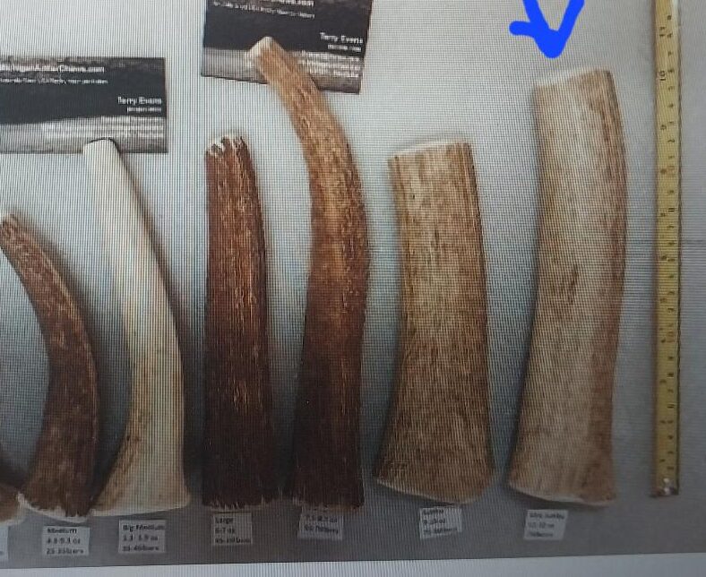 Dog Size – 75lbers + If you have a much bigger dog, consider the one pounders 🙂 Antler Weight – 11-12 ounce each Length – 9 to 11 inches Will be Wild Rocky Mountain Elk Beams and long tines. Rocky Mountain Deer by request in Hard only. Many Thanks, Terry Michigan Antler Since 1994