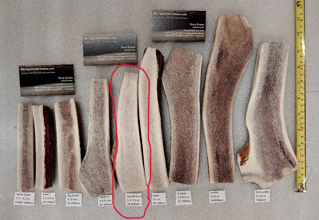 Dog Size – 35-45lbers Antler Weight – 5 -5.9 ounce each Length -6 to 8 inches – some longer – If you prefer shorter, let me know As listed are medium to medium hard strength. If you need a tad harder or lighter please add a short note with purchase 🙂 Many Thanks, Terry Michigan Antler Since 1994