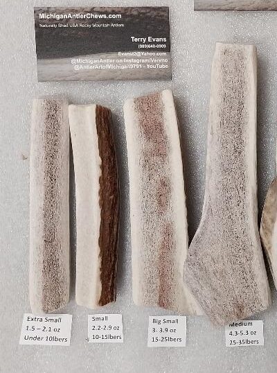 Dog Size – Under 10lbs Antler Weight – 1.5 to 2.1 ounce each Length – 4 to 5 inches As listed are medium to medium hard strength. If you need a tad harder or lighter please add a short note with purchase 🙂 Many Thanks, Terry Michigan Antler Since 1994
