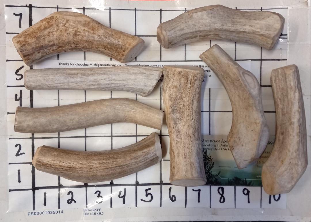 These are a wonderful deal for a pound. They are Harder chews that are meant to be slowly knawed down by steady chewers, high activity dogs….If you have one, you know what Im talking about…lol..  See below for options, if needed. You can expect 4 chews per order in a pound sized for dogs in the 35 to 50lbs. —If you have a dog under 35lbs, please add a note so I can pick you 5 in a pound in the 5 inch range. —If you have a dog over 65lbs please consider asking for 3 bigger ones – in the 6 to 7 inch and fatter. —If you have a dog above 70lbs ask for two in a pound for best results. I call these Antler Chews “Busy Bones” because they are perfect for that busy chewer that destroys all chews and likes to gnaw. These are HARD CHEWS that will stand up to a Busy Chewer. If you would like to mix in another strength with your lot, just add a note.
