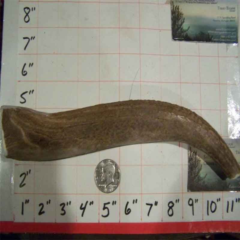 10″ to 11″ Long 4.5″- 5″ Around on cut end and tapers down as in pic 11 to 12 oz 🙂 I am looking for a hard long chew here, it might be an elk tine or a hard beam section 🙂 HARDEST of XLarge! OPTIONS — If you prefer Medium-hard Please request at checkout. Medium hard has a nice core and thicker outer shell and will be just a tad easier than the Hard ones. Same weight – It just gets sized up because of the core 🙂