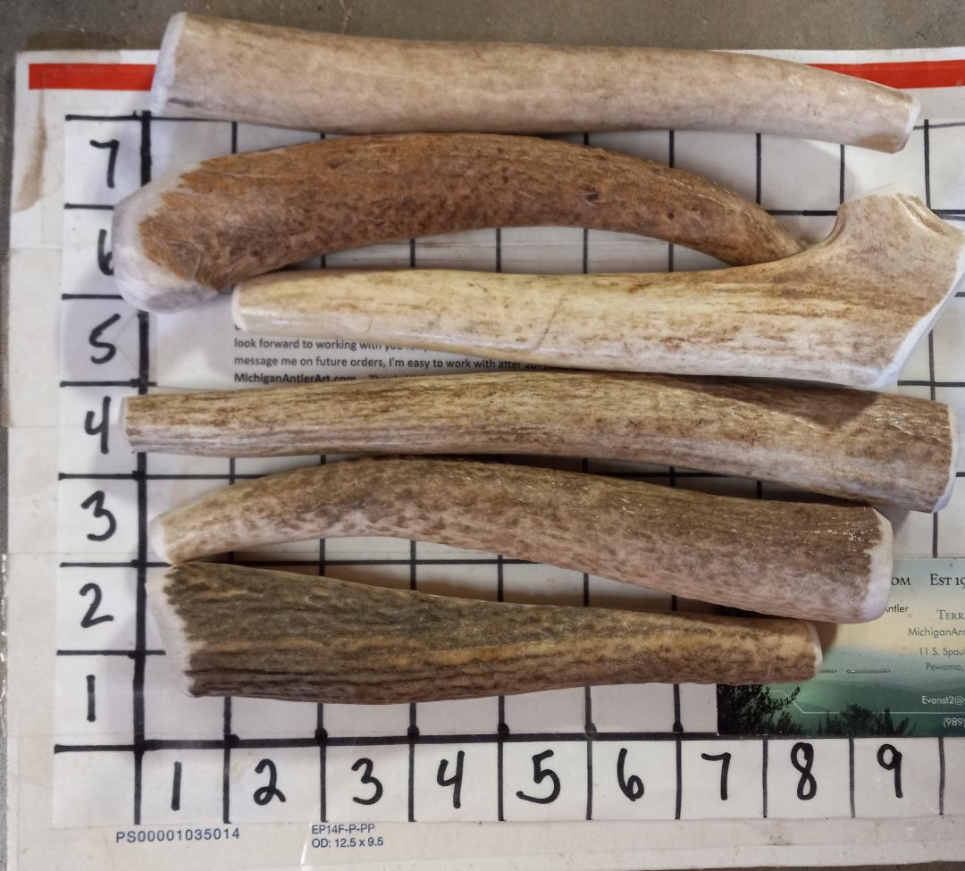 SIX (6) MEDIUM Antler Dog Chews HARD INNER CORE — If  you prefer a different strength or an assortment, just add a message 🙂 At least 6 inches long. I have 24 ounces to work with (1 1/2 pounds), if you have a dog above 45 lbs, consider asking me to send 5 bigger in same weight. 3 to 3.5″ Circumference OPTIONS: Ask for Medium Strength for easier chewing dogs or for a funner experience Ask for Medium Hard if you have a tweener chewer – not to hard–not to light. If I dont hear from you, I will plan on sending my firmer cuts. Thanks! Terry