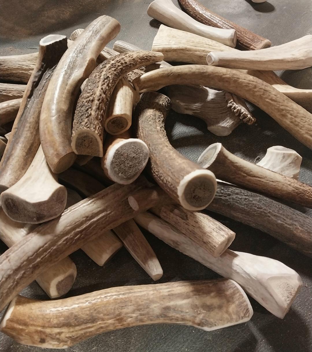 This box consists of smalls, medium, larges and extra larges in a NICE assortment of inner DARK cores. Wholes, splits, deep crowns and chunk chews that are ALL appropriate… no waste sent to fill box. All chewable. Please note, dark inner core can have a slight odor.. although we don’t care for it… the dogs love it…. Because of the possible odor and darker core, please use this outdoors on a mat indoors. The darker core can be messy, but yummy… trade off…