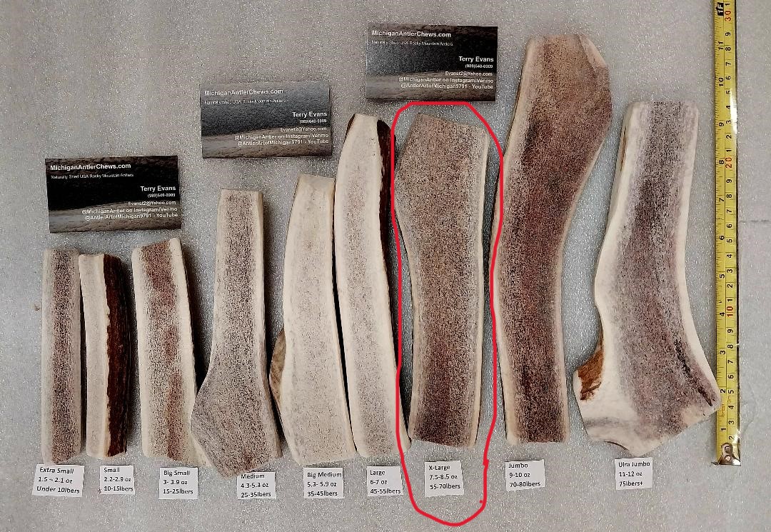 Dog Size – 55-70lbers Antler Weight – I am now sending nicer 8 to 9 ounce Splits – Better weight for XL. This will be a fuller size 🙂 And I didn’t raise the price 🙂 Length – 8 to 9 inches As listed are medium to medium hard strength. If you need a tad harder or lighter please add a short note with purchase 🙂 Many Thanks, Terry Michigan Antler Since 1994